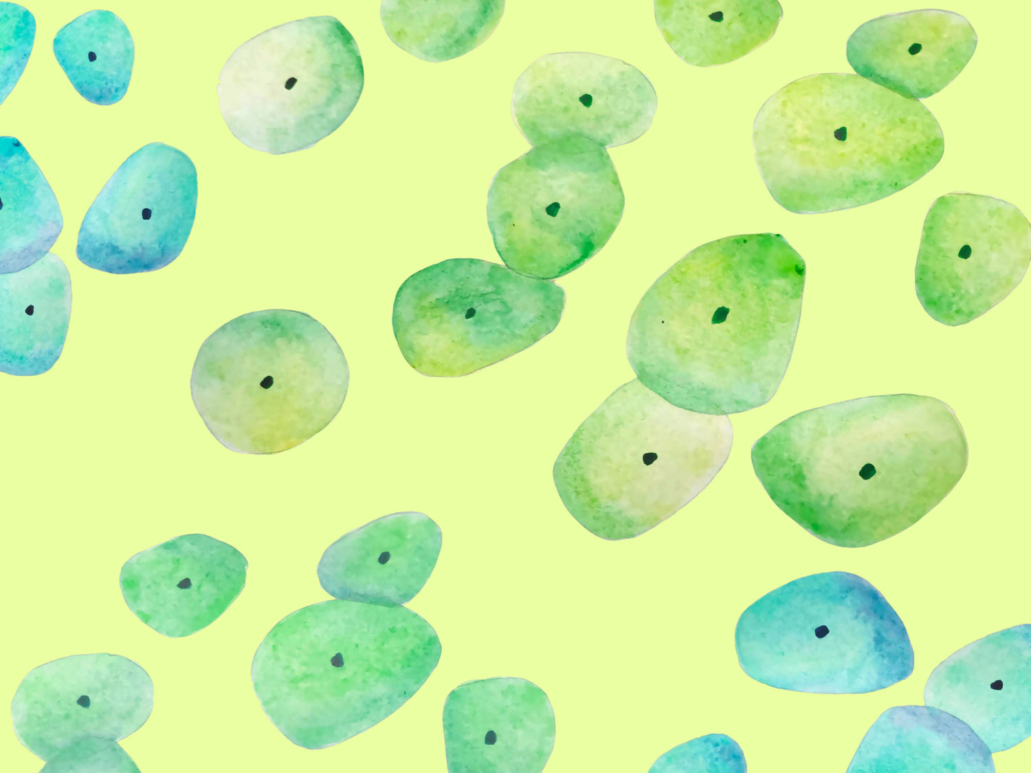 Using soft pastel colours and simple, organic shapes, the cells are arranged over a green background to create a calm, playful pattern.